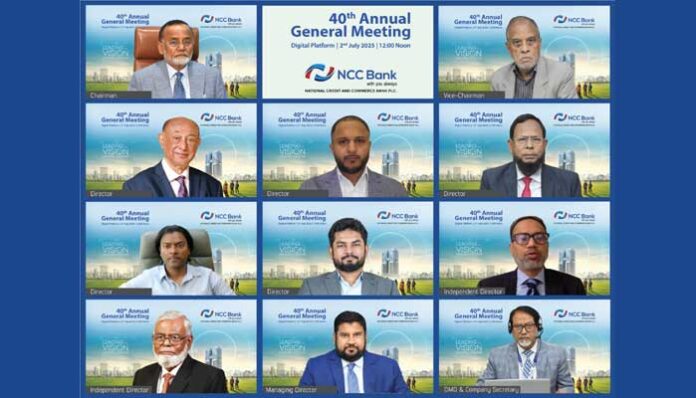কর্পোরেট ডেস্ক: ন্যাশনাল ক্রেডিট এন্ড কমার্স ব্যাংক পিএলসি. এর ৪০তম বার্ষিক সাধারণ সভায় ২০২৪ সালের জন্য ১৩% নগদ লভ্যাংশ অনুমোদন করা হয়েছে। বুধবার (২ জুলাই) ভার্চুয়াল প্লাটফর্মে অনুষ্ঠিত উক্ত সভায় ব্যাংকের চেয়ারম্যান আলহাজ্জ্ব মোঃ নূরুন নেওয়াজ সভাপতিত্বে করেন।