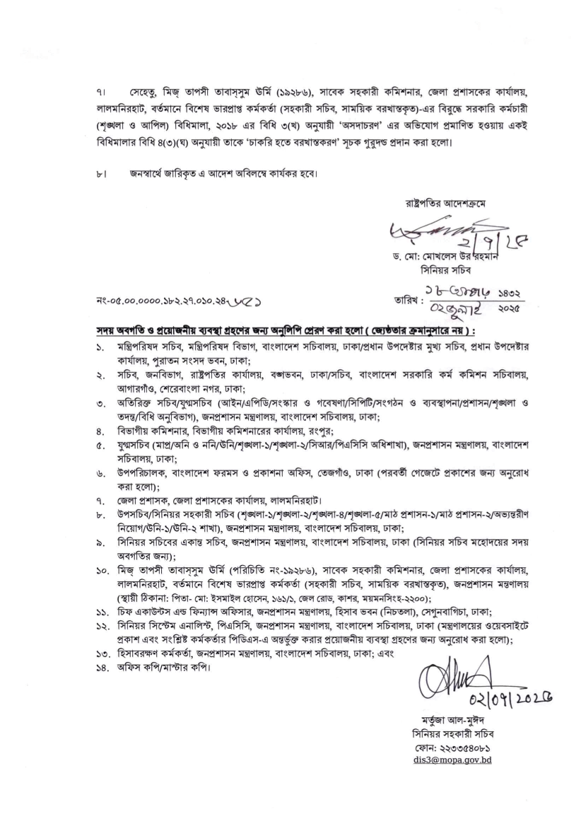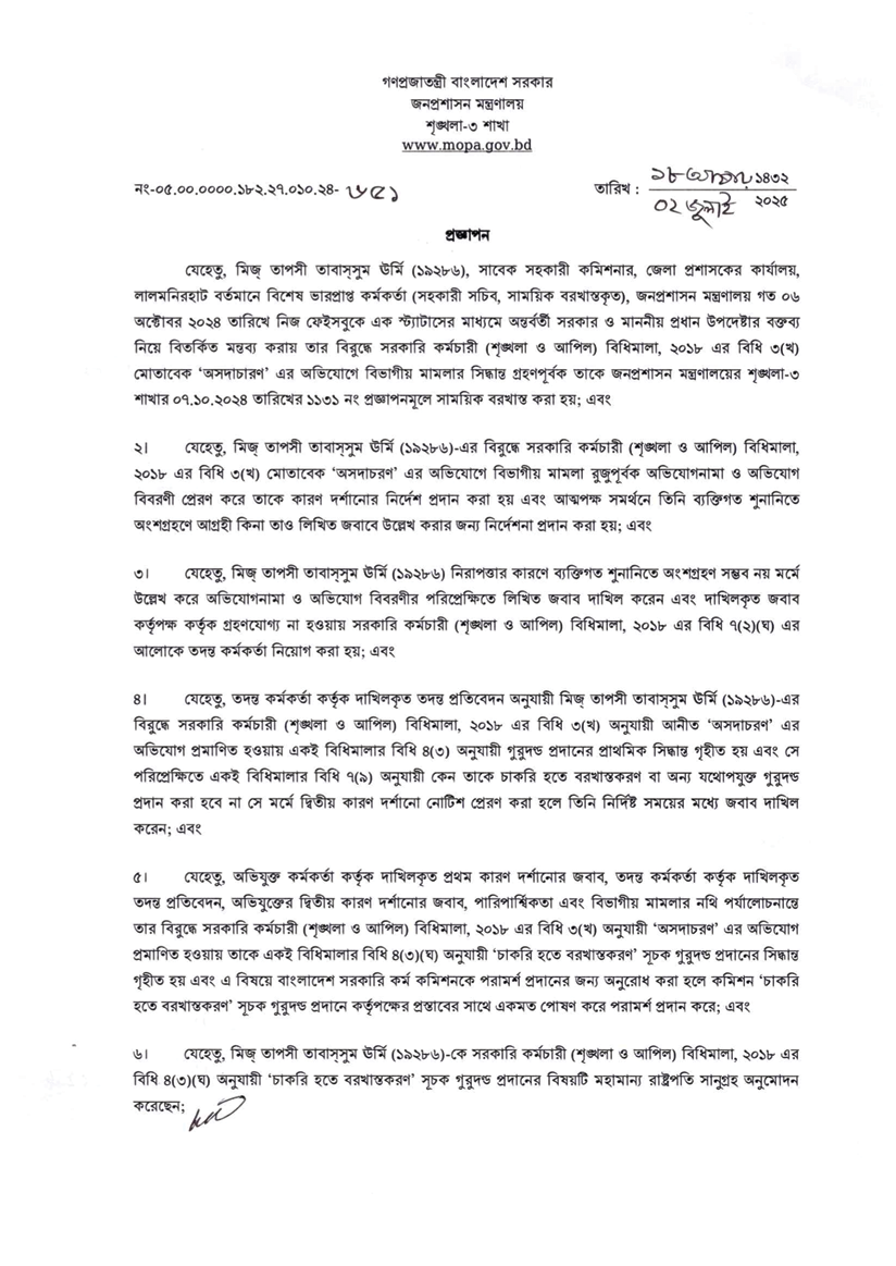 বুধবার (২ জুলাই) বিভাগীয় মামলায় তাকে ‘চাকরি হতে বরখাস্তকরণ’ গুরুদণ্ড দিয়ে জনপ্রশাসন মন্ত্রণালয় থেকে প্রজ্ঞাপন জারি করা হয়েছে।