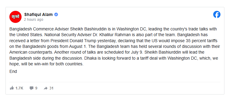 গতকাল বাংলাদেশ যুক্তরাষ্ট্রের প্রেসিডেন্ট ডোনাল্ড ট্রাম্পের কাছ থেকে একটি চিঠি পেয়েছে জানিয়ে তিনি বলেন, যেখানে বলা হয়েছে, ১ আগস্ট থেকে বাংলাদেশি পণ্যের ওপর ৩৫ শতাংশ শুল্ক আরোপ করা হবে।