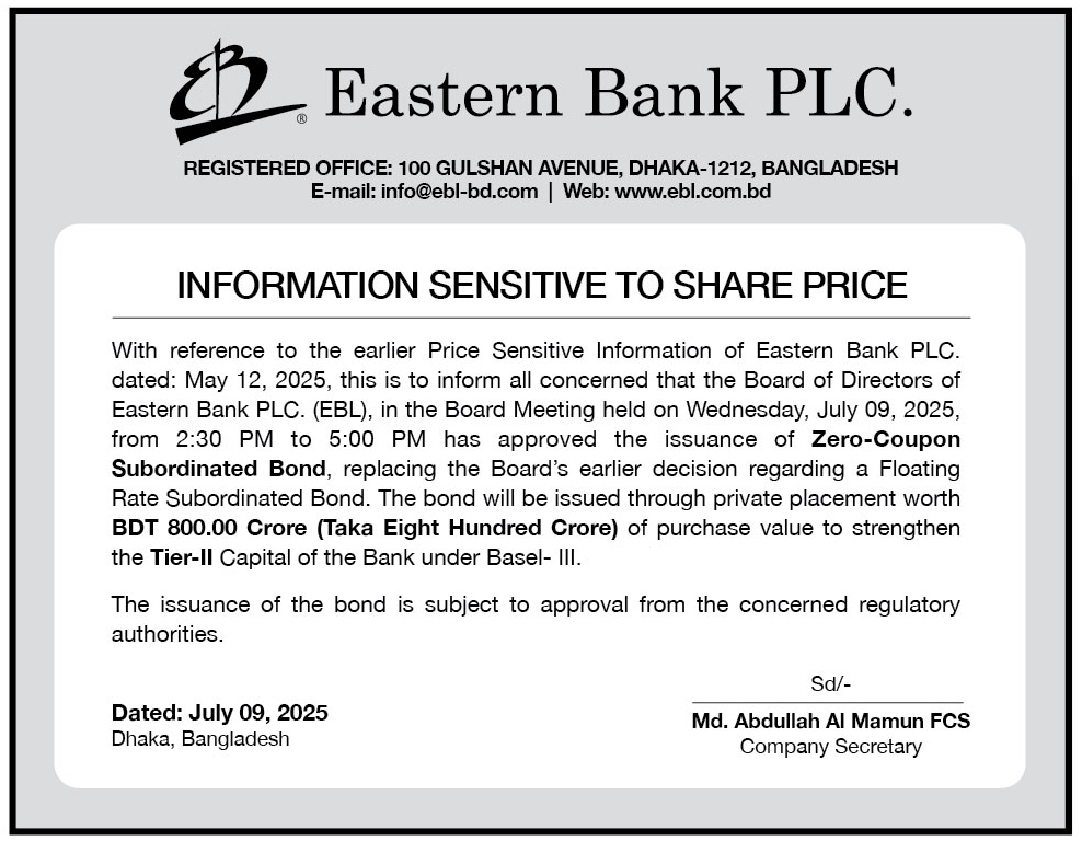 Homeপ্রাইস সেনসিটিভ ইনফরমেশনPrice Sensitive Information of Eastern Bank PLC.