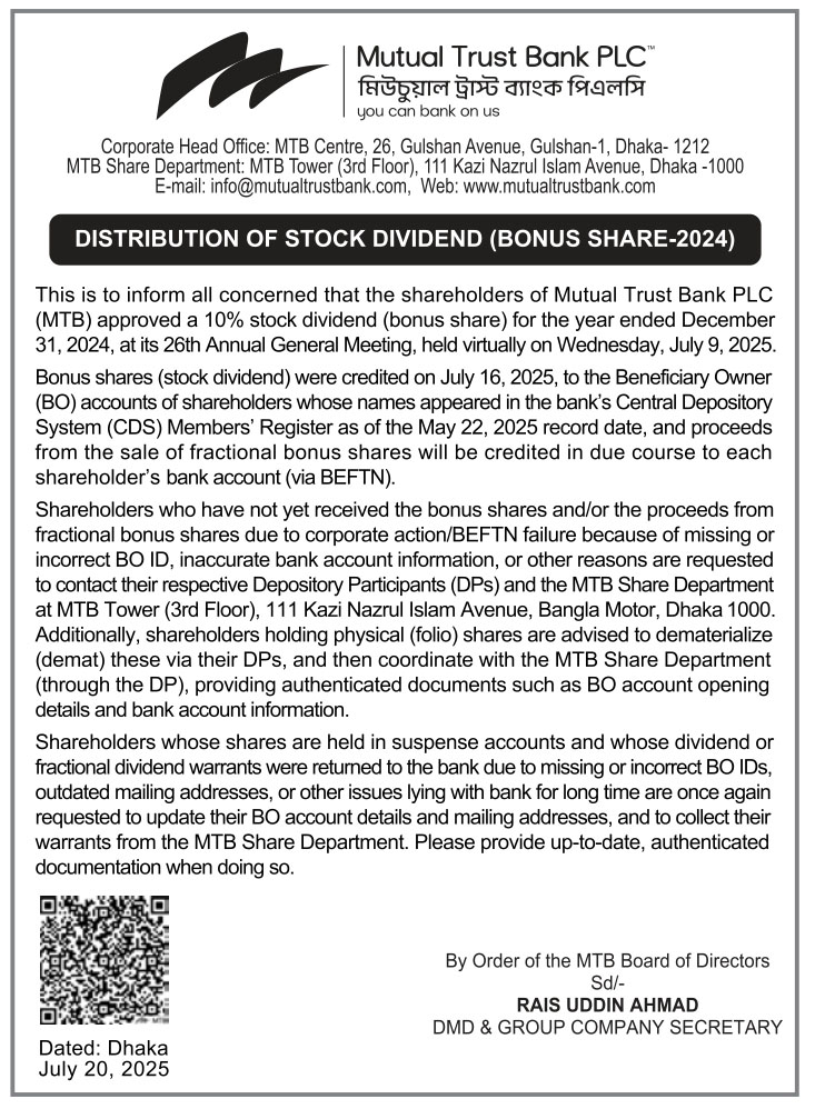 Distribution of Stock Dividend (Bonus Share-2024) of Mutual Trust Bank PLC