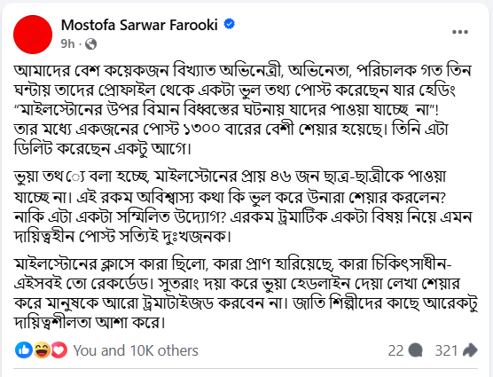 ফেসবুক পোস্টে মোস্তফা সরয়ার ফারুকী লেখেন, আমাদের বেশ কয়েকজন বিখ্যাত অভিনেত্রী, অভিনেতা, পরিচালক গত তিন ঘণ্টায় তাদের প্রোফাইল থেকে একটা ভুল তথ্য পোস্ট করেছেন যার হেডিং ‘মাইলস্টোনের উপর বিমান বিধ্বস্তের ঘটনায় যাদের পাওয়া যাচ্ছে না’! তার মধ্যে একজনের পোস্ট ১৩০০ বারের বেশি শেয়ার হয়েছে। তিনি এটা ডিলিট করেছেন একটু আগে।