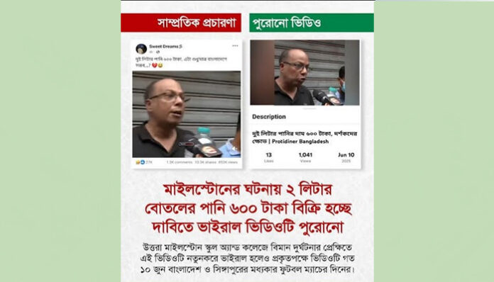 অনুসন্ধান টিম ফ্যাক্টচেক করে জানায়, ‘২ লিটার পানির বোতল ৬০০ টাকায় বিক্রি হচ্ছে’ এমন দাবিতে ভাইরাল হওয়া ভিডিওটি পুরোনো ও ভিন্ন ঘটনার সঙ্গে সম্পৃক্ত।