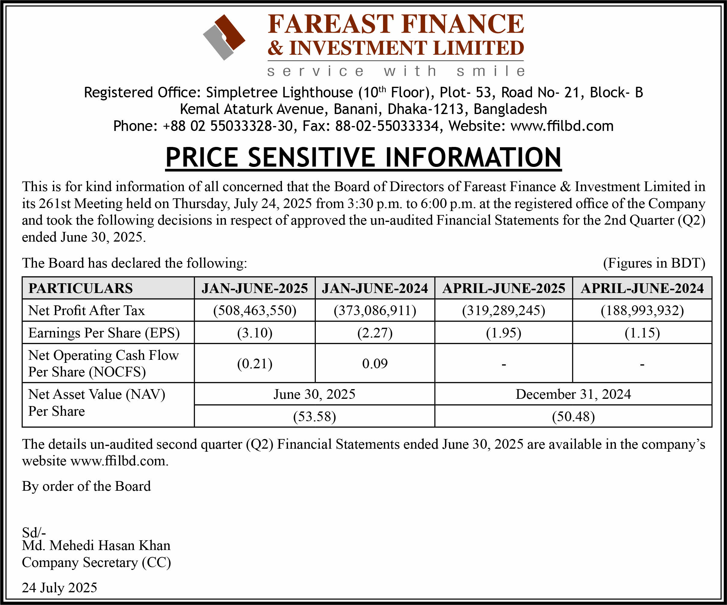 Price Sensitive Information of Fareast Finance & Investment Ltd.