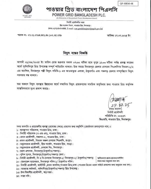 এতে বলা হয়, ১ আগস্ট সকাল ৭টা থেকে বেলা ১২টা পর্যন্ত পূর্বসাদিপুর গ্রিড উপকেন্দ্র সম্পূর্ণ শাটডাউন থাকবে। ফলে ওই সময়ে দিনাজপুর জেলার নেসকো বিতরণ-১/২ এর আংশিক, দিনাজপুর পল্লী বিদ্যুৎ সমিতি-১ এর আওতাভুক্ত এলাকা, ঠাকুরগাঁও এবং পঞ্চগড় জেলায় সম্পূর্ণরূপে বিদ্যুৎ সরবরাহ বন্ধ থাকবে।