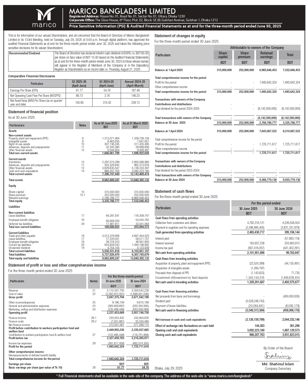 Homeপ্রাইস সেনসিটিভ ইনফরমেশনPSI & Audited Financial Statements of Marico Bangladesh Ltd.