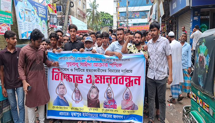 নোয়াখালী প্রতিনিধি: নোয়াখালীর কোম্পানীগঞ্জে যৌতুকের জন্য গৃহবধূ সাঈদা আক্তার পপি (২৫) হত্যার বিচার দাবিতে মানববন্ধন ও বিক্ষোভ করেছেন এলাকার বাসিন্দারা।।