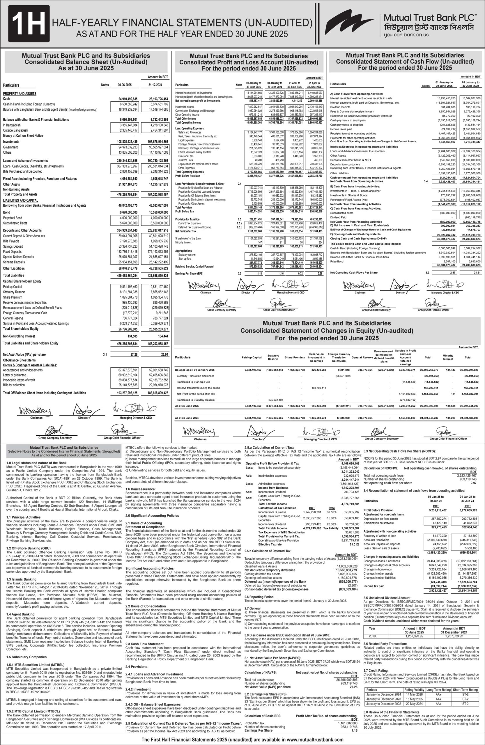 Half Yearly Financial Statements (Un-Audited) of Mutual Trust Bank PLC.