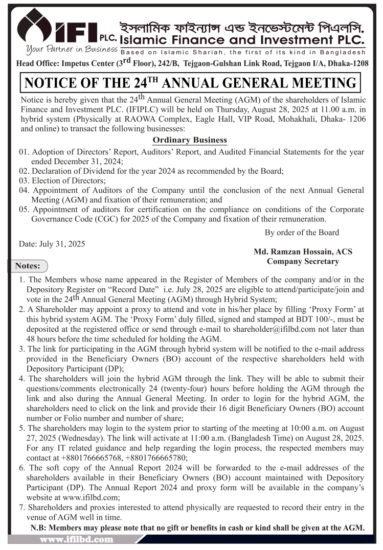 Homeপ্রাইস সেনসিটিভ ইনফরমেশনNotice of the 24th AGM of Islamic Finance and Investment PLC.