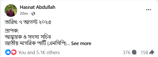 আপনার স্বাক্ষরিত ০৬ আগস্ট ২০২৫ তারিখের স্মারক নং এনসিপি/শোকজ/২০২৫-২০২৫/০৮ নম্বর কারণ দর্শানোর নোটিশটি আমি অত্যন্ত গুরুত্বের সঙ্গে গ্রহণ করেছি এবং এনসিপির প্রতি আমার অঙ্গীকার ও দায়বোধ থেকেই আমি এই ব্যাখ্যা লিখছি।