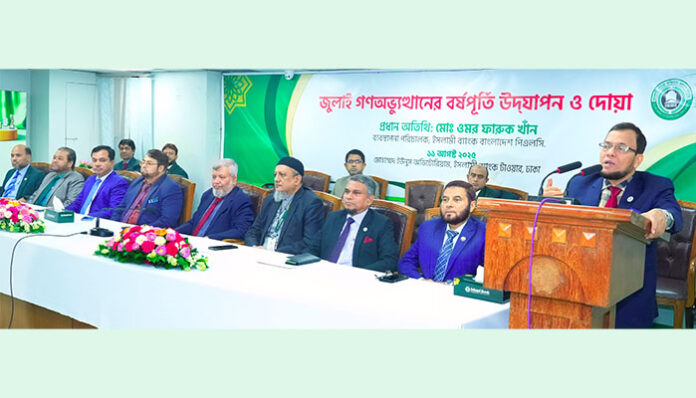 কর্পোরেট ডেস্ক: ইসলামী ব্যাংক অফিসার কল্যাণ সমিতির উদ্যোগে জুলাই গণঅভ্যুত্থানের বর্ষপুর্তি উদযাপন ও দোয়া অনুষ্ঠান সোমবার (১১ আগস্ট) ইসলামী ব্যাংক টাওয়ারে অনুষ্ঠিত হয়েছে। অনুষ্ঠানে প্রধান অতিথি হিসেবে বক্তব্য দেন ব্যাংকের ম্যানেজিং ডাইরেক্টর মোঃ ওমর ফারুক খাঁন।