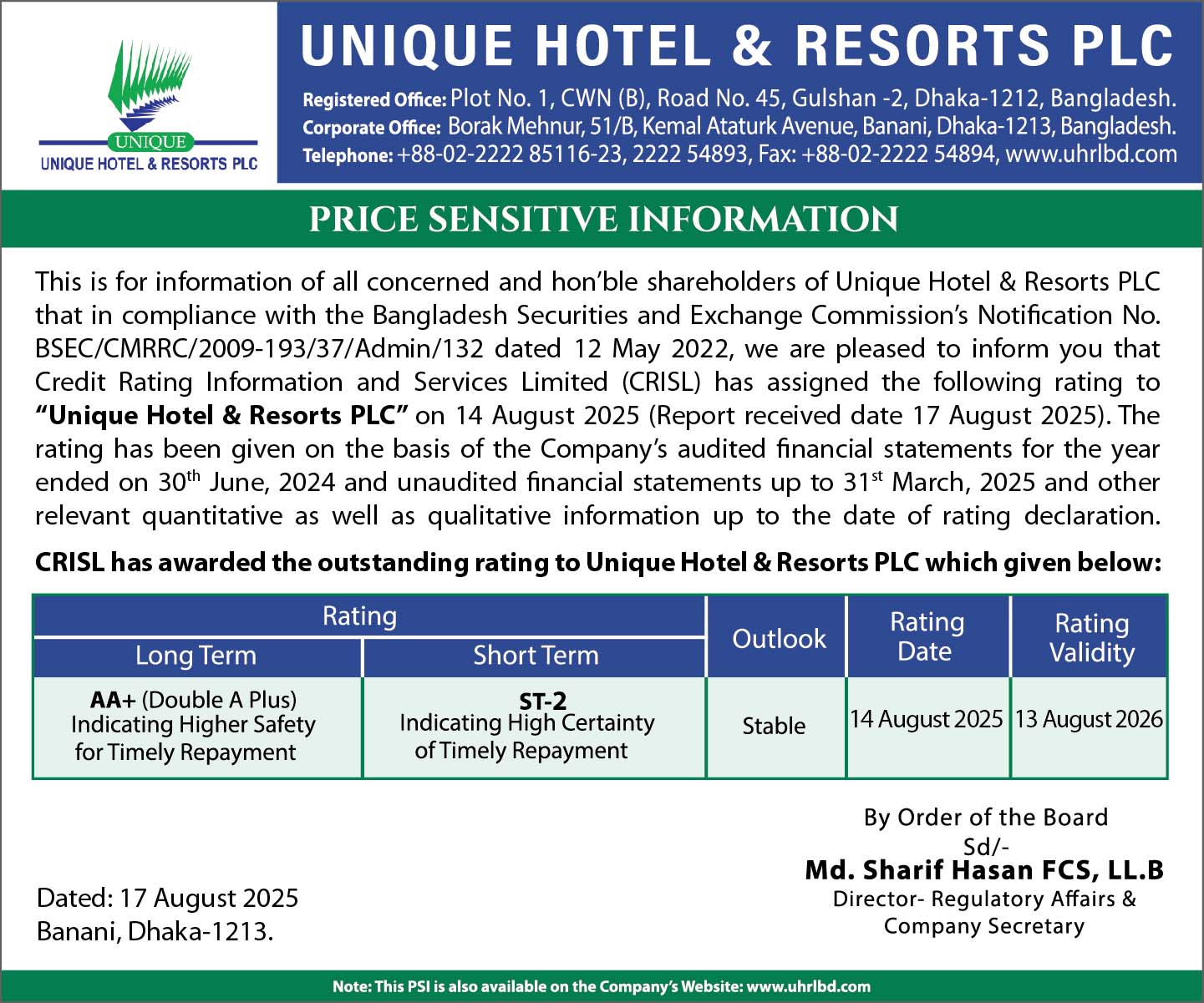 Homeপ্রাইস সেনসিটিভ ইনফরমেশনCredit Rating Information of Unique Hotel & Resorts PLC.