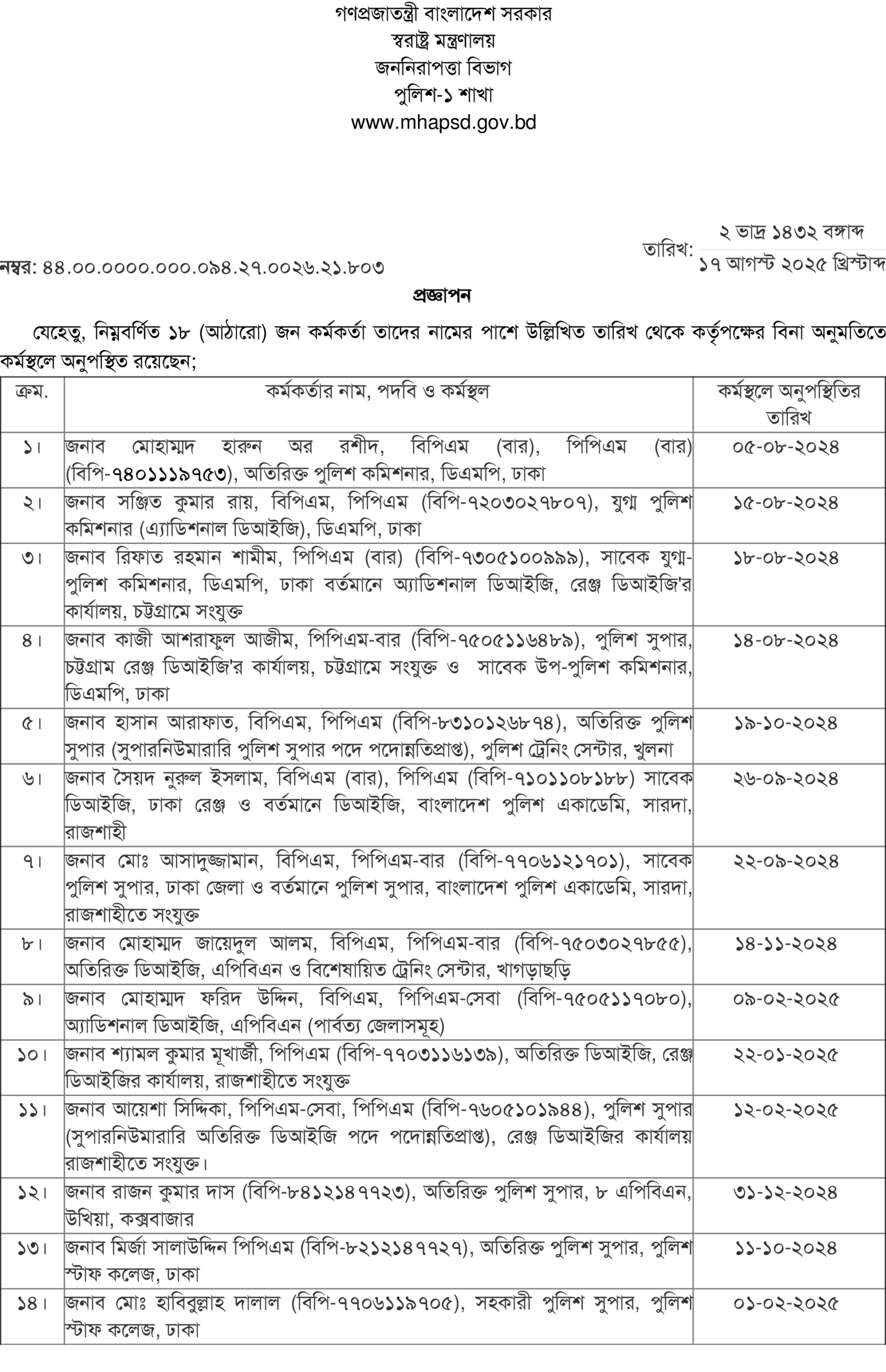প্রজ্ঞাপনে বলা হয়, ১৮ জন কর্মকর্তাকে সরকারি কর্মচারী (শৃঙ্খলা ও আপিল) বিধিমালা, ২০১৮ এর ৩(গ) অনুযায়ী পলায়নের শাস্তিযোগ্য অপরাধে অভিযুক্ত হওয়ায় বিধি ১২ উপবিধি (১) অনুযায়ী তাদের নামের পাশে উল্লিখিত তারিখ থেকে চাকরি থেকে সাময়িক বরখাস্ত করা হলো।