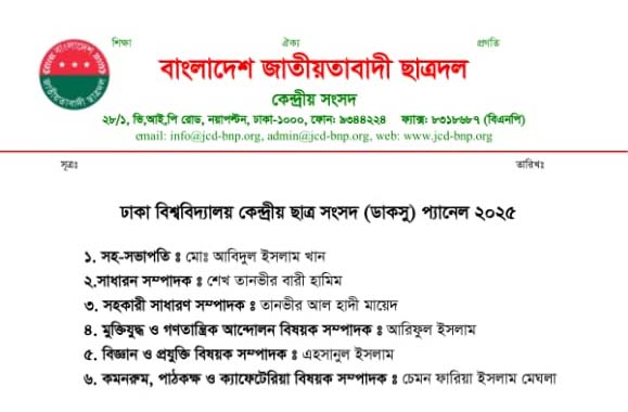 বুধবার (২০ আগস্ট) দুপুর ১২টায় ঢাকা বিশ্ববিদ্যালয়ের (ঢাবি) অপরাজেয় বাংলার পাদদেশে আয়োজিত এক সংবাদ এই প্যানেল ঘোষণা করেন ছাত্রদলের সভাপতি রাকিবুল ইসলাম রাকিব।