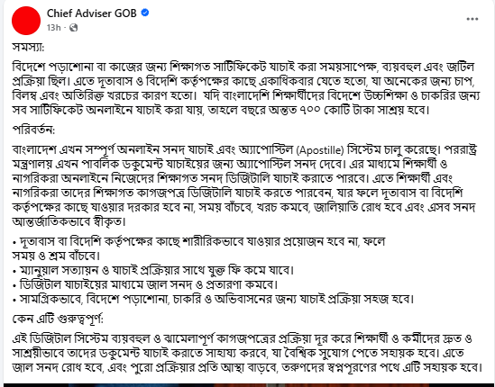 পোস্টে বলা হয়, বিদেশে পড়াশোনা বা কাজের জন্য শিক্ষাগত সার্টিফিকেট যাচাই করা সময়সাপেক্ষ, ব্যয়বহুল ও জটিল প্রক্রিয়া ছিল। এতে দূতাবাস ও বিদেশি কর্তৃপক্ষের কাছে একাধিকবার যেতে হতো, যা অনেকের জন্য চাপ, বিলম্ব এবং অতিরিক্ত খরচের কারণ হতো। যদি বাংলাদেশি শিক্ষার্থীদের বিদেশে উচ্চশিক্ষা ও চাকরির জন্য সব সার্টিফিকেট অনলাইনে যাচাই করা যায়, তাহলে বছরে অন্তত ৭০০ কোটি টাকা সাশ্রয় হবে।