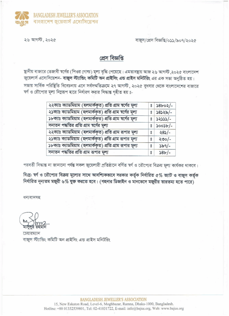 মঙ্গলবার (২৬ আগস্ট) রাতে এক বিজ্ঞপ্তিতে এ তথ্য জানিয়েছে বাংলাদেশ জুয়েলার্স অ্যাসোসিয়েশন (বাজুস)।