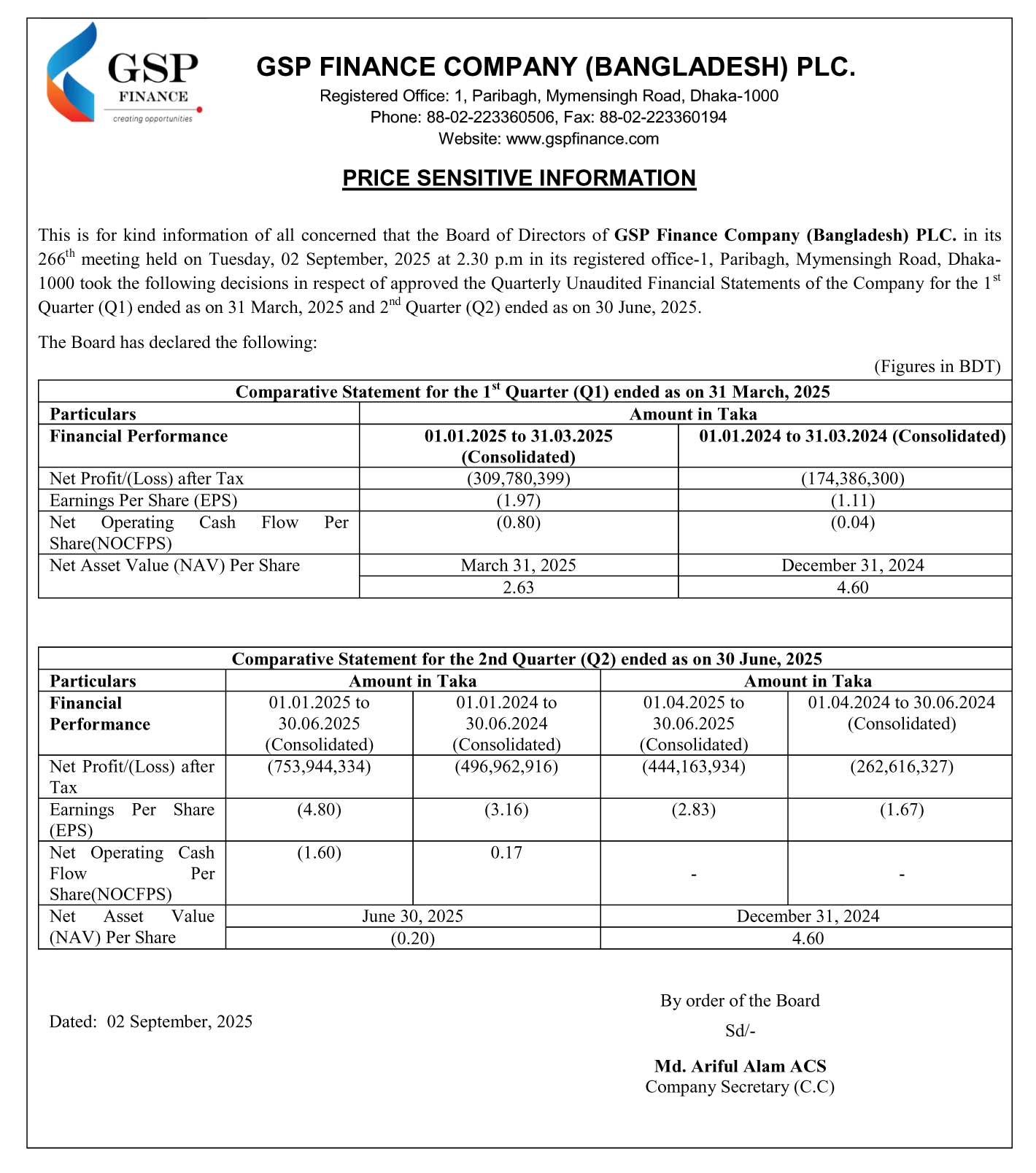 Homeপ্রাইস সেনসিটিভ ইনফরমেশনPSI on 2nd Quarter Financial Statements of GSP Finance