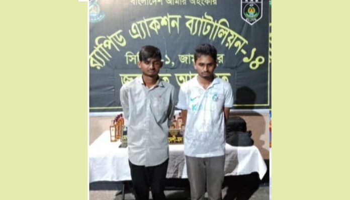 জানা গেছে, গোপন সূত্রে সংবাদের ভিত্তিতে বুধবার রাত আটটার দিকে সদর উপজেলার চরপক্ষীমারী ইউনিয়নের সাতপাকিয়া এলাকায় চন্দ্রিমা ফিলিং স্টেশনের সামনের রাস্তায় চেকপোস্ট স্থাপন করে র্যাব-১৪। পরে চেকপোস্ট দেখে শেরপুর থেকে জামালপুরগামী একটি সিএনজি থেকে সাগর কুমার দে (২২) ও দুর্জয় সাহা ওরফে তথ্য কৌশলে পালোনোর চেষ্টাকালে তাদের আটক করা হয়। ওইসময় তাদের হেফাজতে থাকা পৃথক পৃথক ব্যাগ থেকে ২৫ বোতল ভারতীয় মদ উদ্ধার ও একটি মোবাইল ফোন জব্দ করা হয়। উদ্ধারকৃত বিদেশী মদের আনুমানিক মূল্য ৫০ হাজার টাকা।