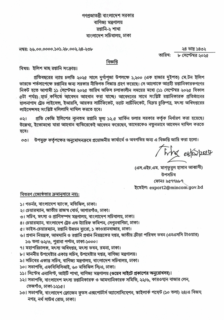 বিজ্ঞপ্তিতে বলা হয়, প্রতিবছরের ন্যায় চলতি ২০২৫ সালে দুর্গাপূজা উপলক্ষে এক হাজার ২০০ টন ইলিশ ভারতে শর্তসাপেক্ষে রপ্তানির জন্য সরকার নীতিগত সিদ্ধান্ত গ্রহণ করেছে। সে আলোকে আগ্রহী রপ্তানিকারকদের নিকট হতে আগামী ১১ সেপ্টেম্বর বিকাল ৫টা পর্যন্ত অফিস চলাকালীন সময়ের মধ্যে হার্ড কপিতে আবেদন আহ্বান করা হচ্ছে।