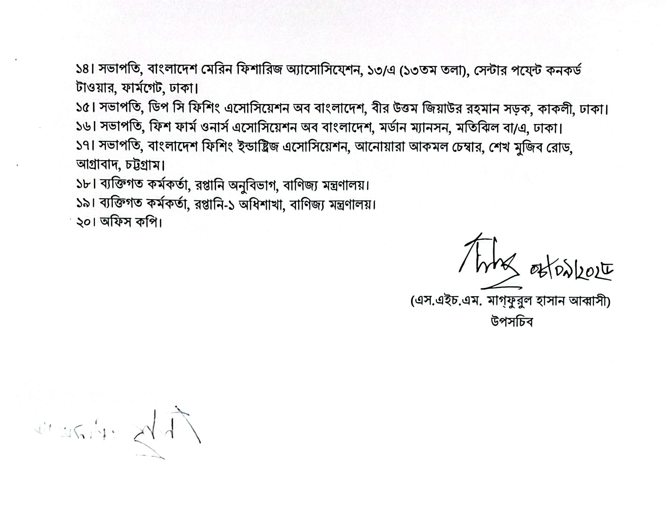 বিজ্ঞপ্তিতে উল্লেখ করা হয়, আবেদনের সঙ্গে সংশ্লিষ্ট রপ্তানিকারক প্রতিষ্ঠানের হালনাগাদ ট্রেড লাইসেন্স, ইআরসি, আয়কর সার্টিফিকেট, ভ্যাট সার্টিফিকেট, বিক্রয় চুক্তিপত্র, মৎস্য অধিদপ্তরের লাইসেন্সসহ সংশ্লিষ্ট দলিলাদি দাখিল করতে হবে।