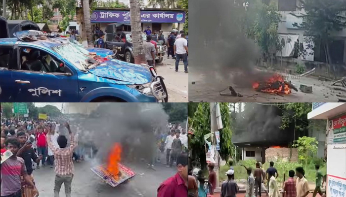 এদিকে, আইনশৃঙ্খলা কাজে নিয়োজিত পুলিশ সদস্যরা বিক্ষোভকারীদের সড়ক থেকে সরিয়ে দেয়ার চেষ্টা করে ব্যর্থ হয়েছে। জনতার ধাওয়া খেয়ে মডেল মসজিদে পুলিশ সদস্যরা অবস্থান করতে দেখা গেছে। বিক্ষোভকারীরা ভাঙ্গা উপজেলা পরিষদ ও ভাঙ্গা থানায় হামলা করে ভাঙচুর চালিয়েছে। এ ছাড়া উপজেলা অফিসার্স ক্লাবে আগুন ধরিয়ে দেন তারা।