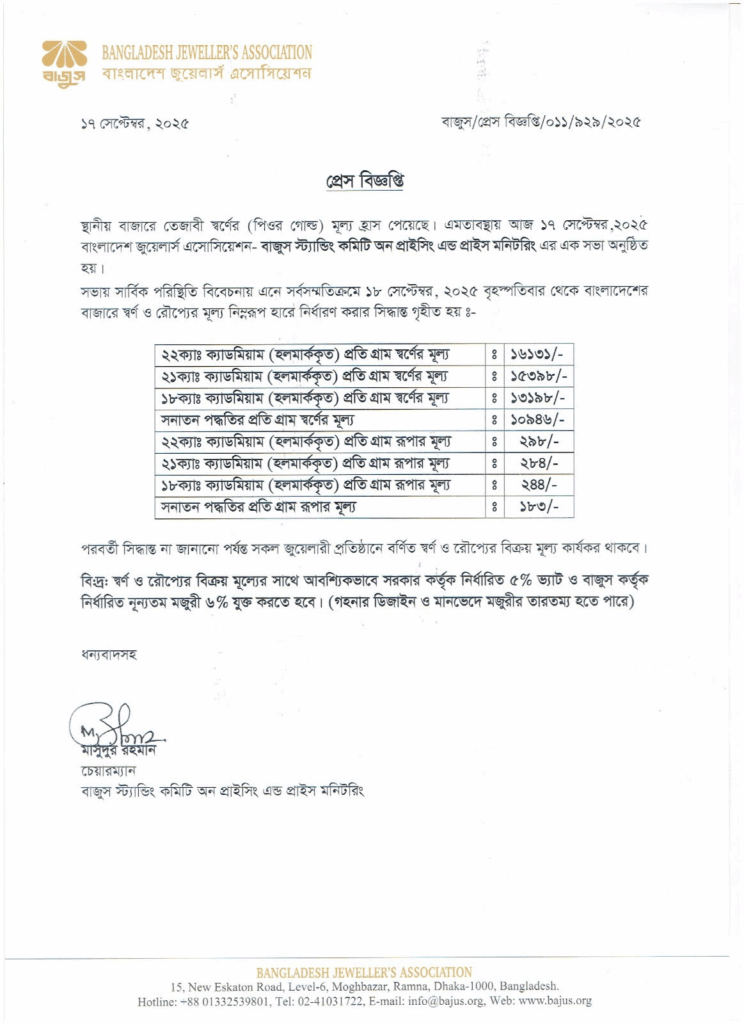 এদিকে বিজ্ঞপ্তিতে বাজুস জানিয়েছে, সোনার বিক্রয়মূল্যের সঙ্গে আবশ্যিকভাবে সরকার-নির্ধারিত ৫ শতাংশ ভ্যাট ও বাজুস-নির্ধারিত ন্যূনতম মজুরি ৬ শতাংশ যুক্ত করতে হবে। তবে গহনার ডিজাইন ও মানভেদে মজুরির তারতম্য হতে পারে।