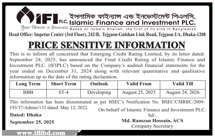 Homeপ্রাইস সেনসিটিভ ইনফরমেশনPrice Sensitive Information Islamic Finance and Investment PLC.