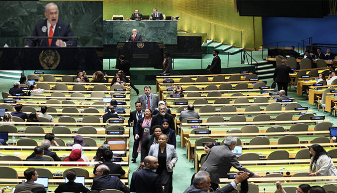 শুক্রবার (২৬ সেপ্টেম্বর) অধিবেশন কক্ষের পোডিয়ামে দাঁড়িয়ে নেতানিয়াহু বক্তব্য দেওয়া শুরুর সঙ্গে সঙ্গে বেরিয়ে যান বিশ্বের কয়েকশ কূটনীতিক।