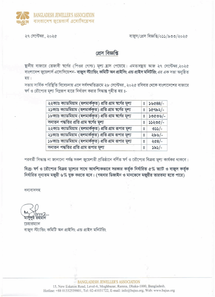 এ ছাড়া সোনার বিক্রয়মূল্যের সঙ্গে আবশ্যিকভাবে সরকার-নির্ধারিত ৫ শতাংশ ভ্যাট ও বাজুস-নির্ধারিত ন্যূনতম মজুরি ৬ শতাংশ যুক্ত করতে হবে। তবে গহনার ডিজাইন ও মানভেদে মজুরির তারতম্য হতে পারে।
