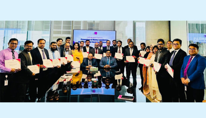 কর্পোরেট ডেস্ক: পদ্মা ব্যাংক পিএলসি এর এএমএল এন্ড সিএফটি ডিভিশন কর্তৃক অর্থ পাচার ও সন্ত্রাসী কর্মকাণ্ডে অর্থায়ন প্রতিরোধ বিষয়ক প্রশিক্ষণ কর্মশালার সার্টিফিকেট প্রদান অনুষ্ঠান ব্যাংকের গুলশানস্থ প্রধান কার্যালয়ে সম্প্রতি অনুষ্ঠিত হয়।