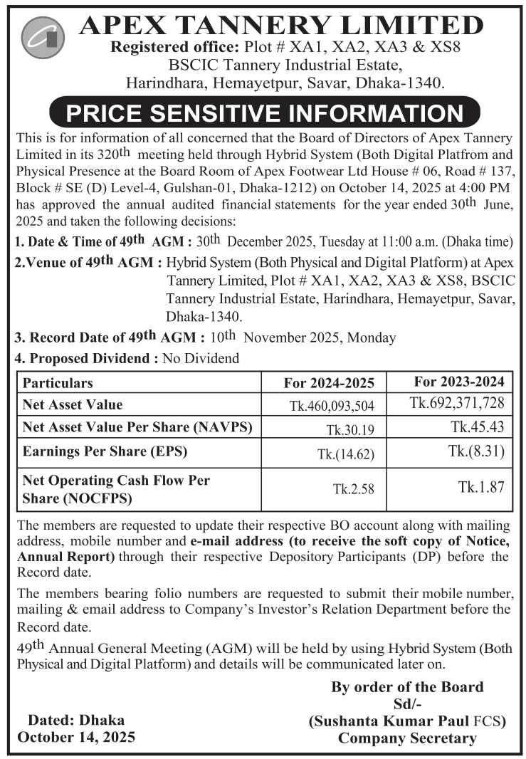 Homeপ্রাইস সেনসিটিভ ইনফরমেশনPrice Sensitive Information of Apex Tannery Ltd.
