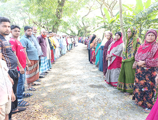 সোমবার (২০ অক্টোবর) সকাল ১০টার দিকে বরুন বাড়ীয়া সরকারি প্রাথমিক বিদ্যালয়ের সামনে শতাধিক নারী-পুরুষ ব্যানার-ফেস্টুন হাতে নিয়ে মানববন্ধনে অংশ নেন।