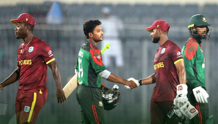 ২১৪ রানের টার্গেট তাড়া করতে নেমে ইনিংসের তৃতীয় বলে ধাক্কা খায় ওয়েস্ট ইন্ডিজ। রানের খাতা খোলার আগেই বাংলাদেশ স্পিনার নাসুম আহেমেদের শিকার হন ওপেনার ব্রান্ডন কিং।