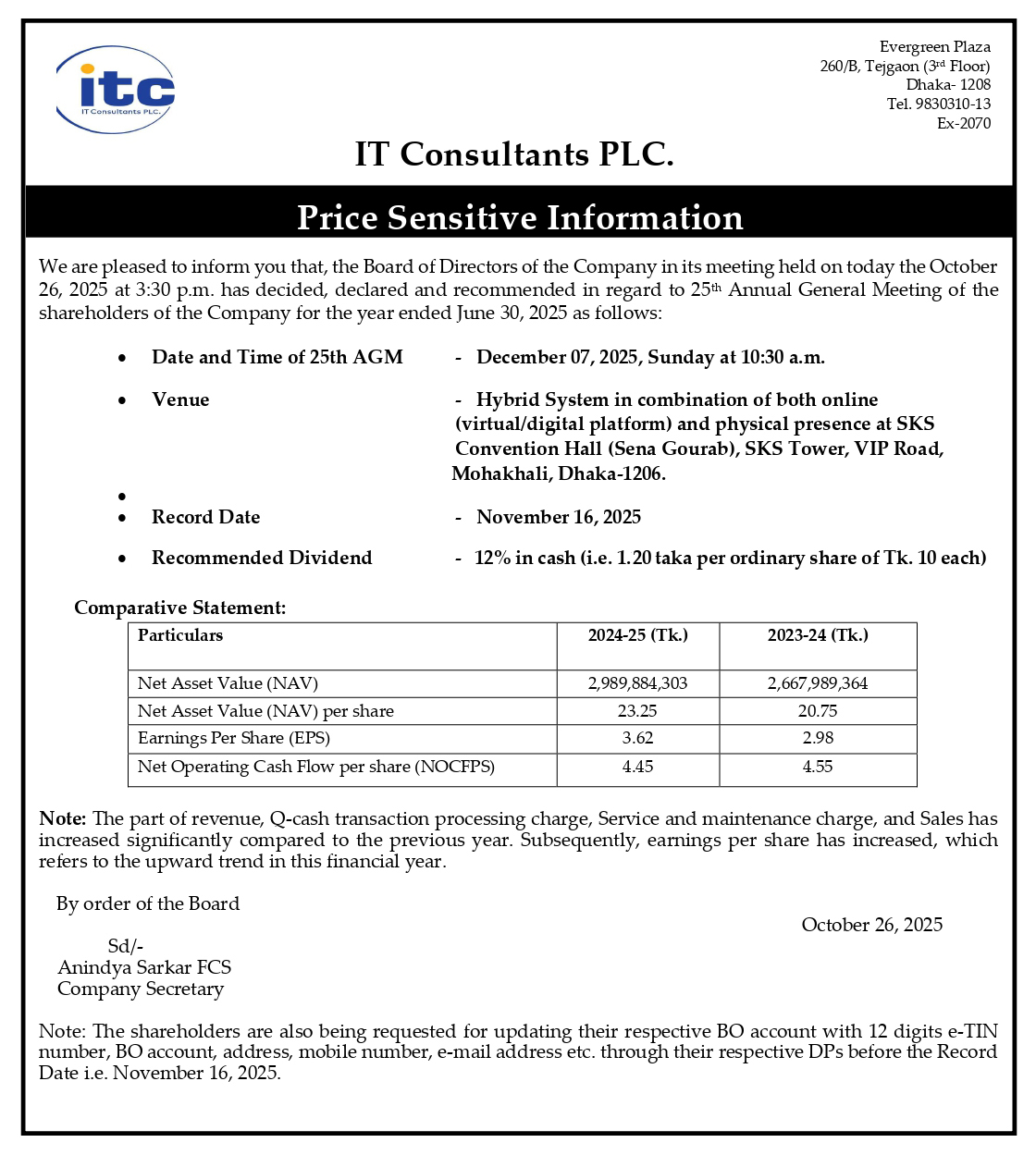 Homeপ্রাইস সেনসিটিভ ইনফরমেশনPrice Sensitive Information of IT Consultants PLC.
