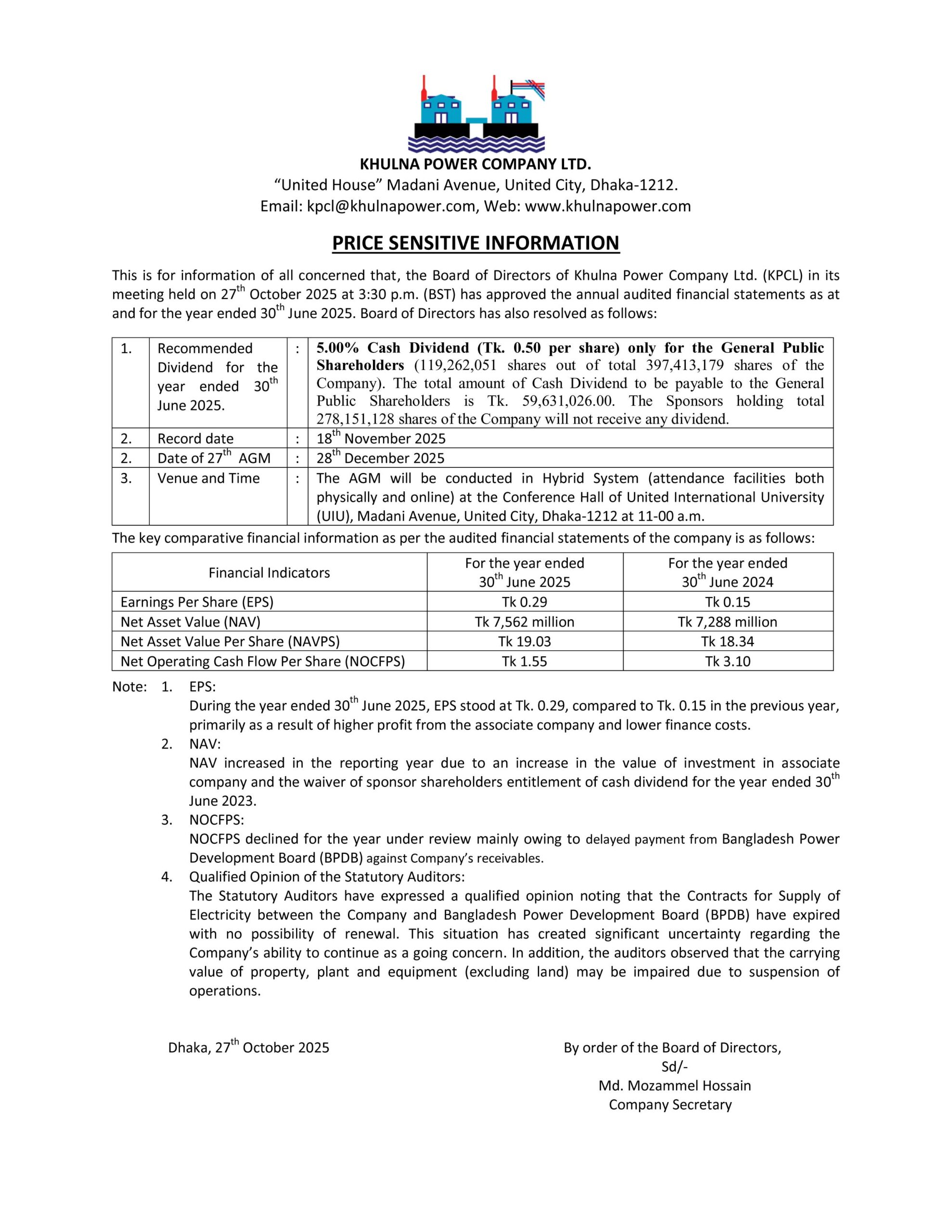Homeপ্রাইস সেনসিটিভ ইনফরমেশনPrice Sensitive Information of Khulna Power Company Ltd.