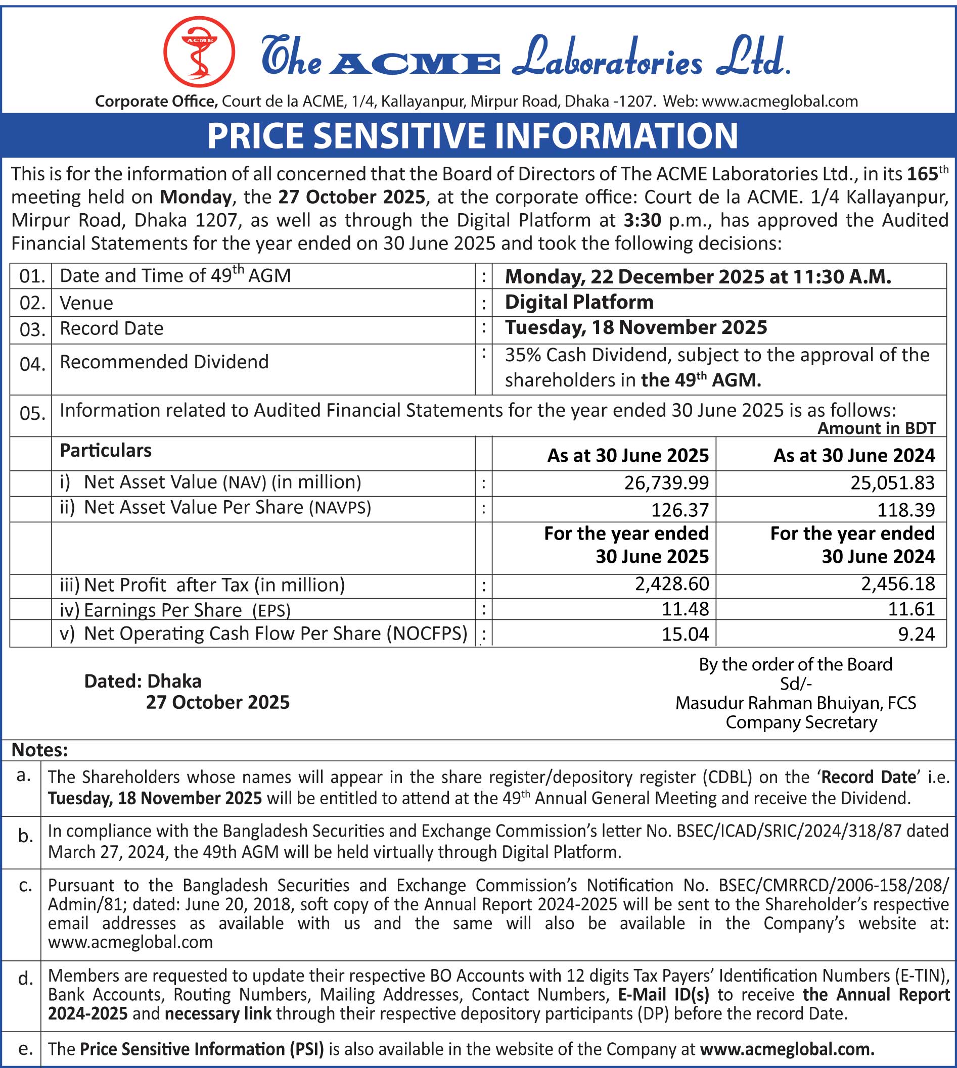 Homeপ্রাইস সেনসিটিভ ইনফরমেশনPrice Sensitive Information of The ACME Laboratories Ltd.