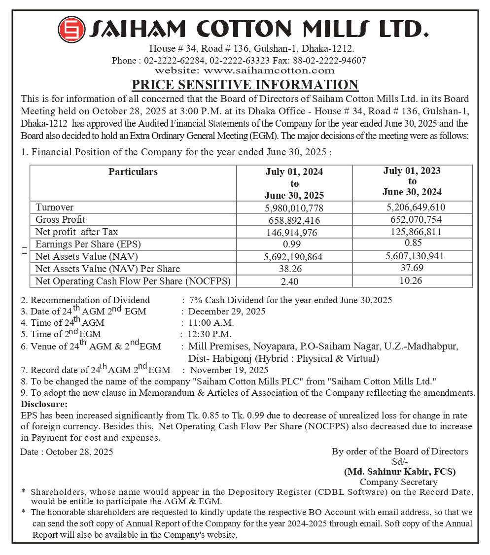 Homeপ্রাইস সেনসিটিভ ইনফরমেশনPrice Sensitive Information of Saiham Cotton Mills Ltd.