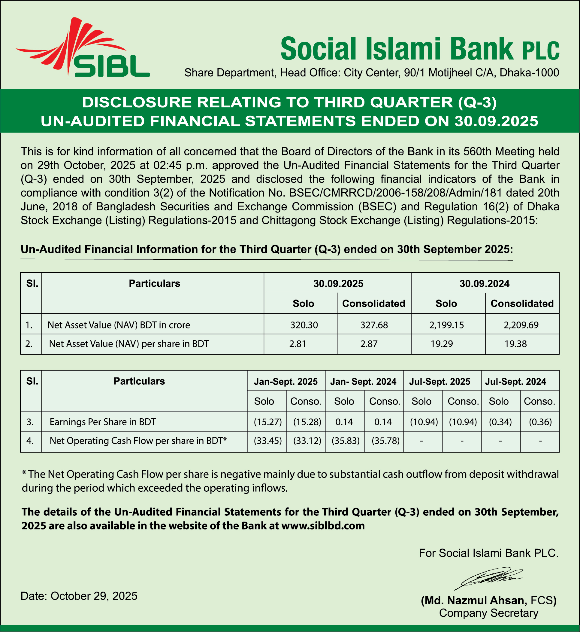 Homeপ্রাইস সেনসিটিভ ইনফরমেশন3rd Quarter Un-Audited Financial Statements of Social Islami Bank PLC.