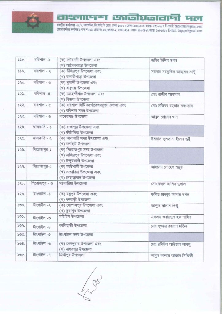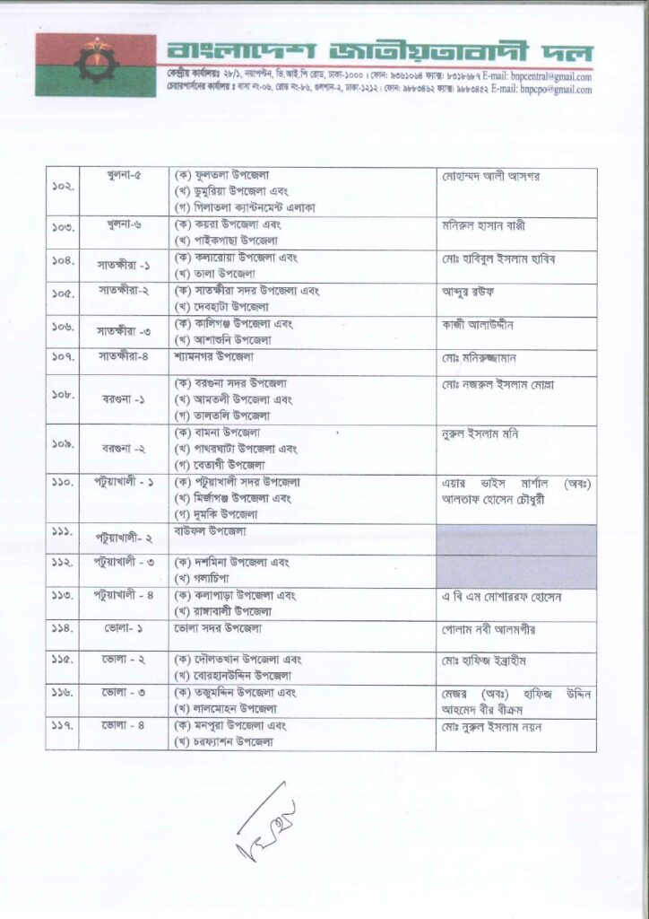 কক্সবাজার-১ আসনে সালাহউদ্দিন আহমদ, কক্সবাজার-৪ শাহজাহান চৌধুরী, চট্টগ্রাম-১ নুরুল আমিন, চট্টগ্রাম-১৩ সরওয়ার জামাল নিজাম, নোয়াখালী-১ আসনে মাহবুব উদ্দিন খোকন, নোয়াখালী-৩ আসনে বরকত উল্লাহ বুলু, ময়মনসিংহ-১ আসনে এমরান সালেহ প্রিন্স, নরসিংদী-২ আসনে ড. আব্দুল মঈন খান, টাঙ্গাইল-৮ আসনে আহমেদ আজম খান।