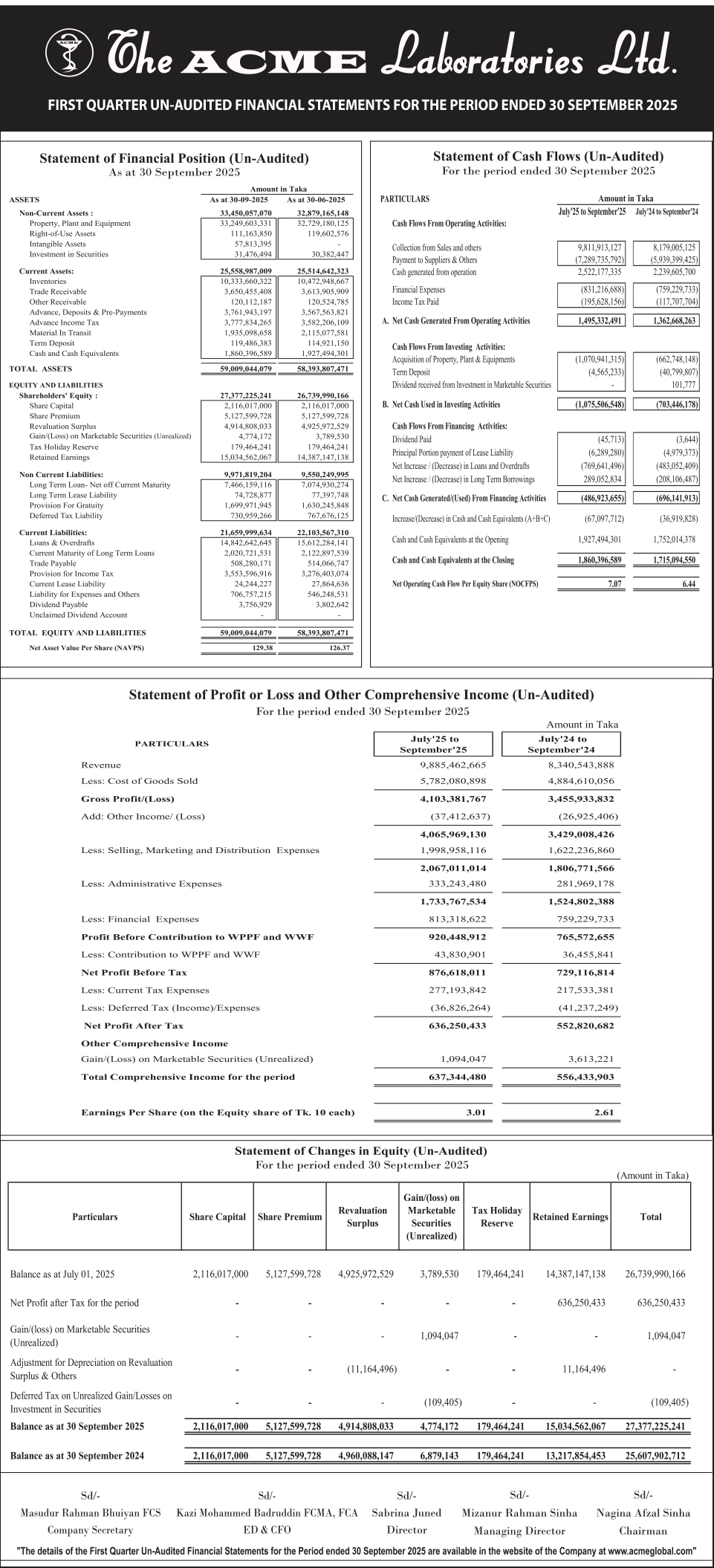 Homeপ্রাইস সেনসিটিভ ইনফরমেশন1st Quarter Un-Audited Financial Statements of The ACME Laboratories Ltd.