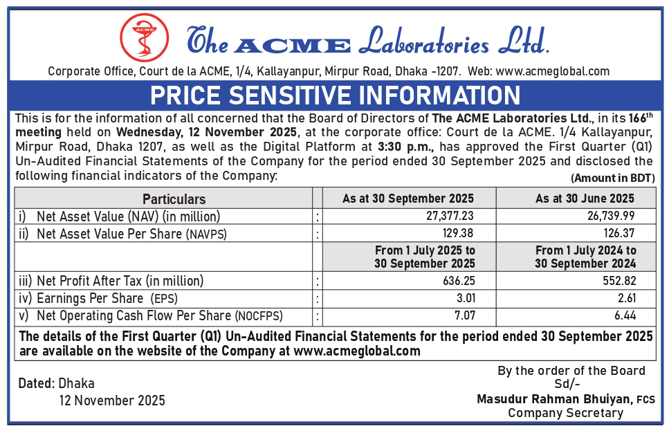 Homeপ্রাইস সেনসিটিভ ইনফরমেশনPrice Sensitive Information of The ACME Laboratories Ltd.