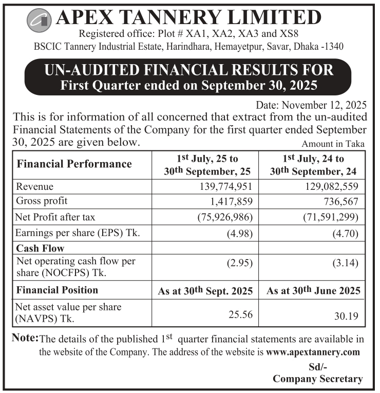 Homeপ্রাইস সেনসিটিভ ইনফরমেশন1st Quarter Un-Audited Financial Statements of Apex Tannery Ltd.