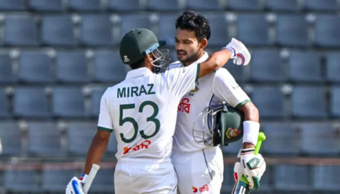 দ্বিতীয় সেশনে বাংলাদেশের অধিনায়ক নাজমুল হোসেন শান্ত দেখা পেয়েছেন সেঞ্চুরির। টেস্ট ক্যারিয়ারে অস্টম সেঞ্চুরির দেখা পেলেন শান্ত, চলতি বছরে এটি তার তৃতীয় টেস্ট সেঞ্চুরি। ১২৯ তম ওভারের দ্বিতীয় বলে ২ রান নিয়ে শতরান পূর্ণ করেন তিনি।