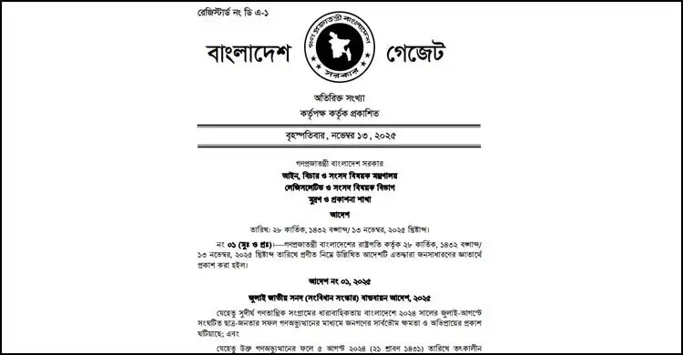 বৃহস্পতিবার (১৩ নভেম্বর) আইন, বিচার ও সংসদ বিষয়ক মন্ত্রণালয়ের লেজিসলেটিভ ও সংসদ বিষয়ক বিভাগ থেকে এ বিষয়ে গেজেট প্রকাশ করা হয়েছে।