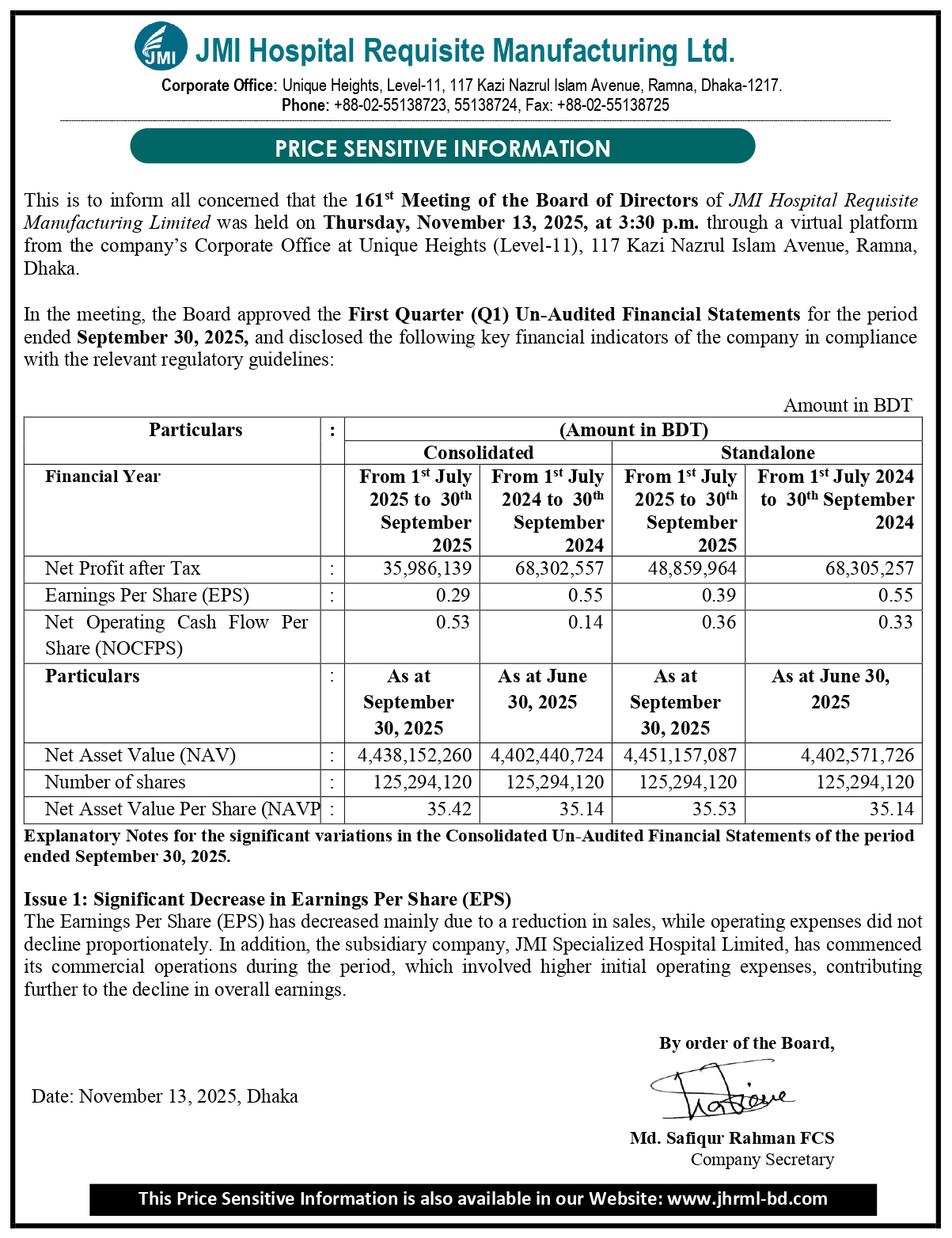 Homeপ্রাইস সেনসিটিভ ইনফরমেশন1st Quarter Un-Audited Financial Statements of JMI Hospital Requisite Manufacturing Ltd.