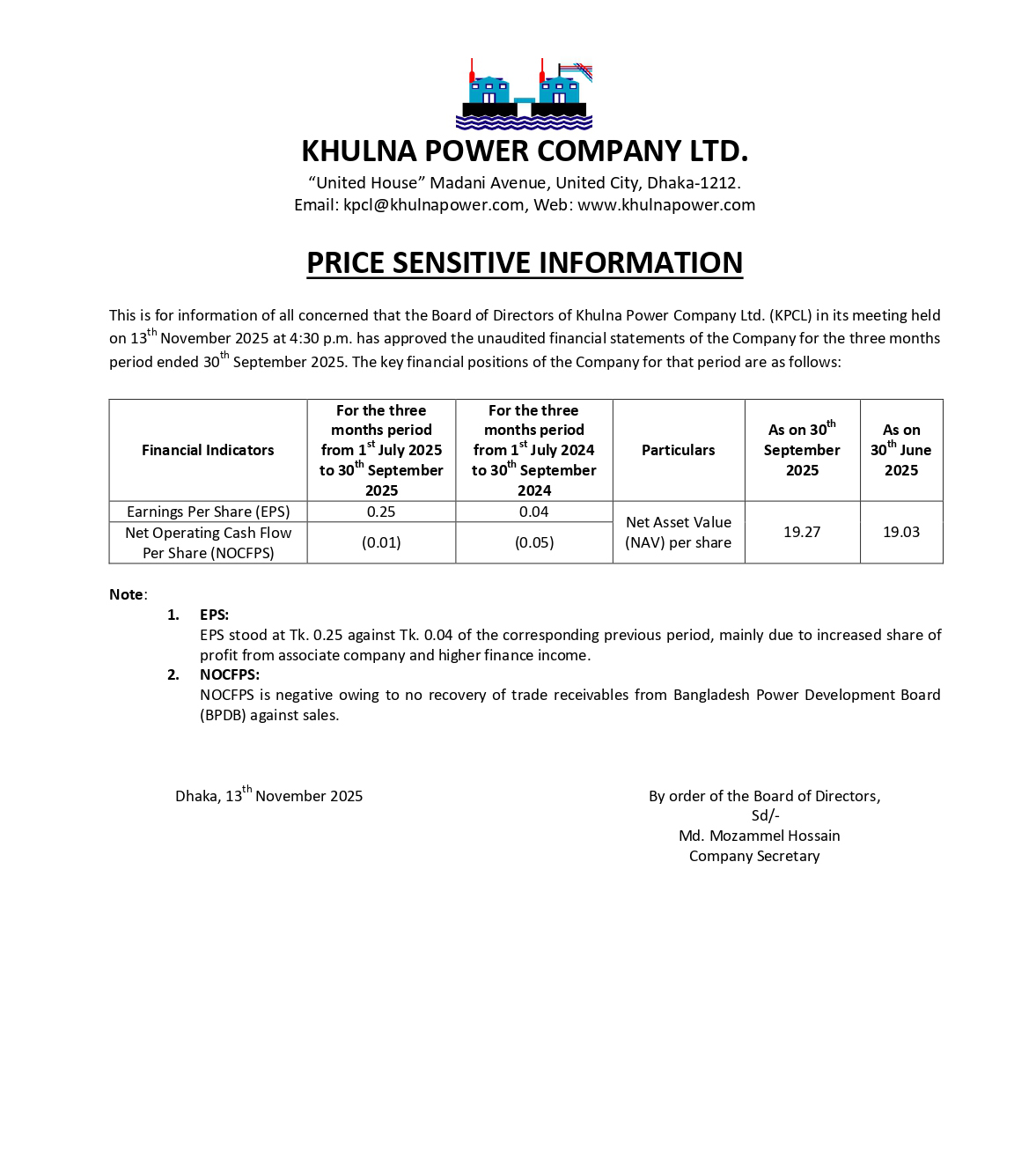 Price Sensitive Information of Khulna Power Company Ltd.