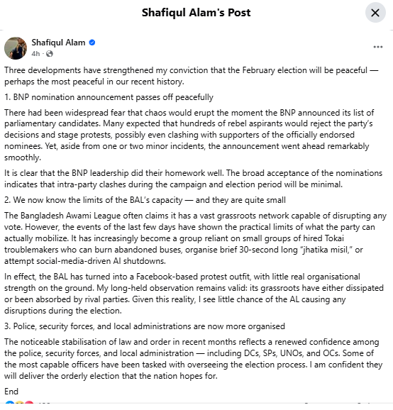 পোস্টে তিনি লেখেন, তিনটি সাম্প্রতিক ঘটনা আমার বিশ্বাসকে আরও শক্তিশালী করেছে যে, ফেব্রুয়ারির নির্বাচন শান্তিপূর্ণ হবে। বরং আমাদের সাম্প্রতিক ইতিহাসে সবচেয়ে শান্তিপূর্ণ নির্বাচন হওয়ার সম্ভাবনাও রয়েছে।
