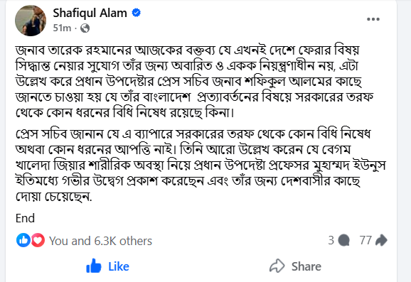 প্রেস সচিব ফেসবুকে লিখেন, ‘জনাব তারেক রহমানের আজকের বক্তব্য যে এখনই দেশে ফেরার বিষয় সিদ্ধান্ত নেয়ার সুযোগ তার জন্য অবারিত ও একক নিয়ন্ত্রণাধীন নয়, এটা উল্লেখ করে প্রধান উপদেষ্টার প্রেস সচিব শফিকুল আলমের কাছে জানতে চাওয়া হয় যে তার বাংলাদেশ প্রত্যাবর্তনের বিষয়ে সরকারের তরফ থেকে কোন ধরনের বিধি নিষেধ রয়েছে কিনা।’