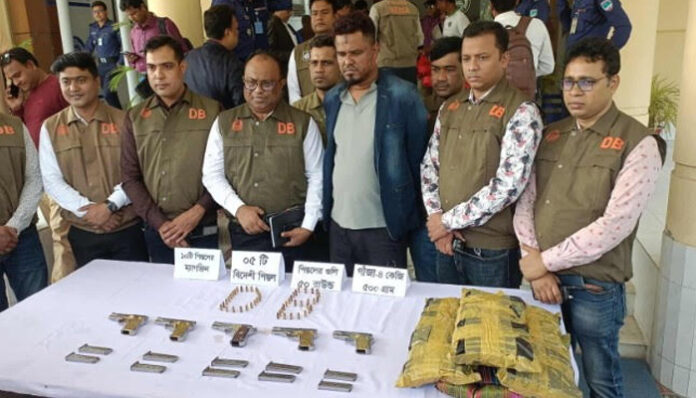 উদ্ধারকৃত অস্ত্রের মধ্যে রয়েছে ৫টি ৭.৬৫ মিমি বিদেশি পিস্তল, ১০টি ম্যাগাজিন, ৫০ রাউন্ড গুলি এবং ৪ কেজি ৫০০ গ্রাম গাঁজা।