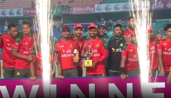 স্পোর্টস ডেস্ক : সিরিজের শেষ ও তৃতীয় টি-টোয়েন্টিতে দাপুটে পারফরম্যান্সে আয়ারল্যান্ডকে ৮ উইকেটে হারিয়ে সিরিজ জিতেছে বাংলাদেশ। চট্টগ্রামে মঙ্গলবার (২ ডিসেম্বর) সিরিজ নির্ধারণী ম্যাচে ১১৮ রানের লক্ষ্যে ব্যাট করতে নেমে ২ উইকেট হারিয়ে ৩৮ বল হাতে রেখে জয় নিশ্চিত করে স্বাগতিকরা। মারকুটে ফিফটির ইনিংসে অপরাজিত ছিলেন তানজিদ হাসান তামিম।